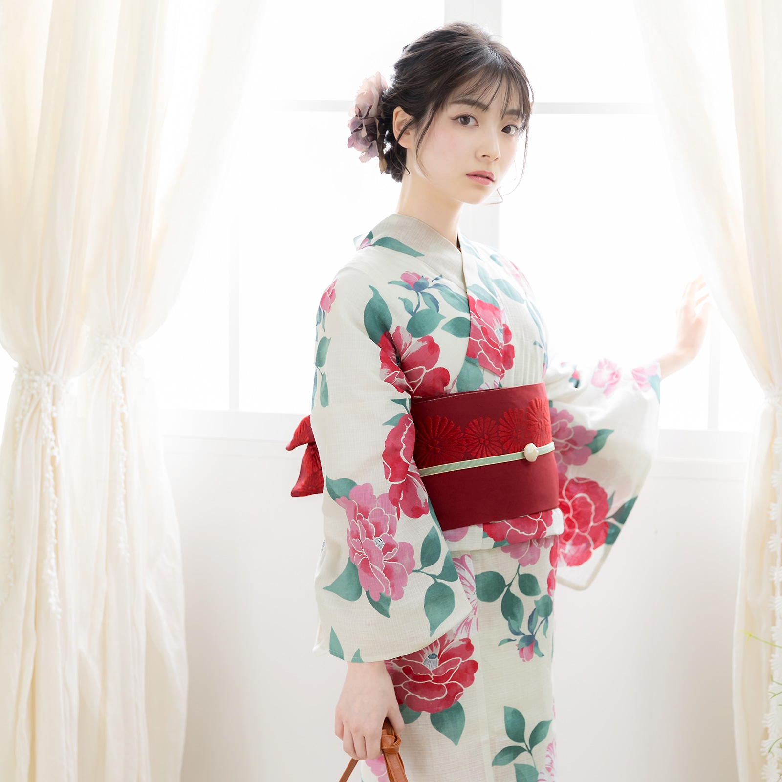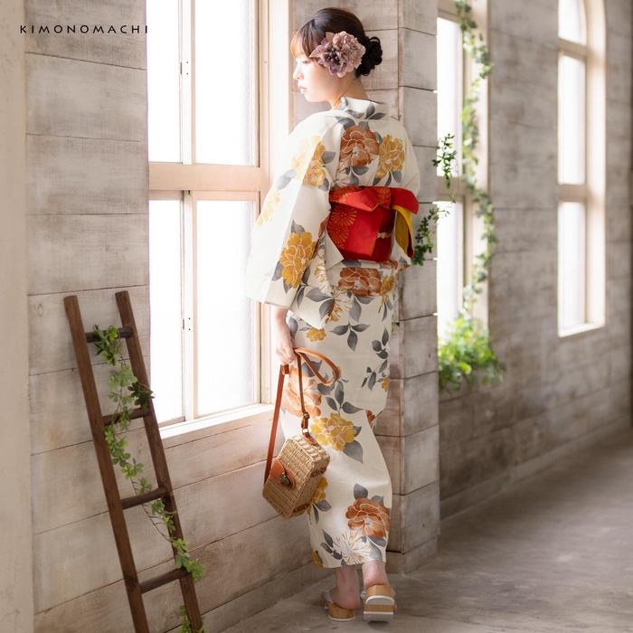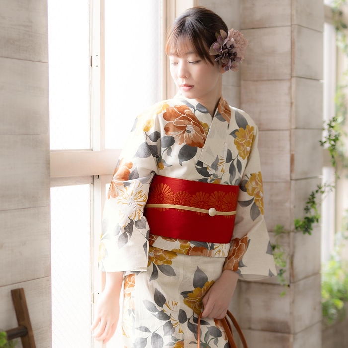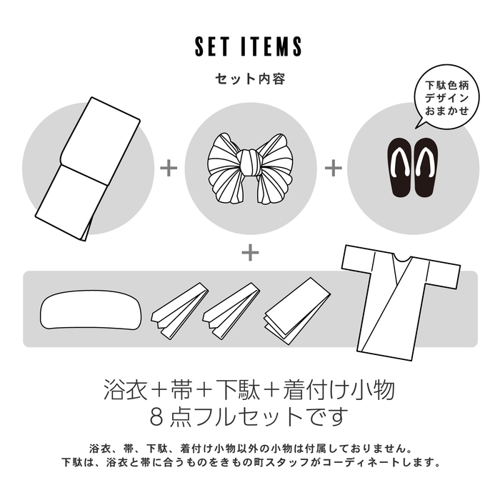 浴衣のみの販売です。帯や下駄、小物類は、それぞれ単品でお好みのものを購入いただいたり、お手持ちのアイテムを合わせて着用可能。