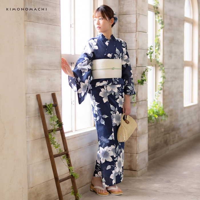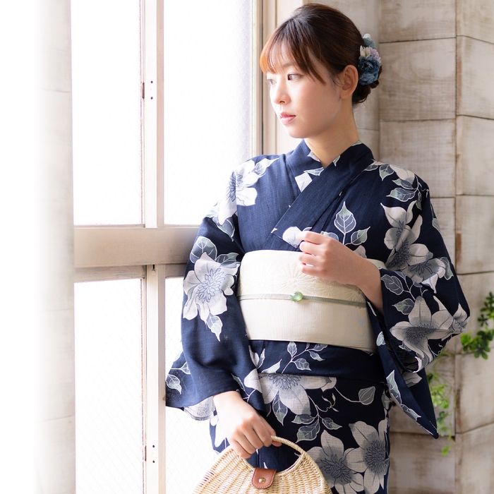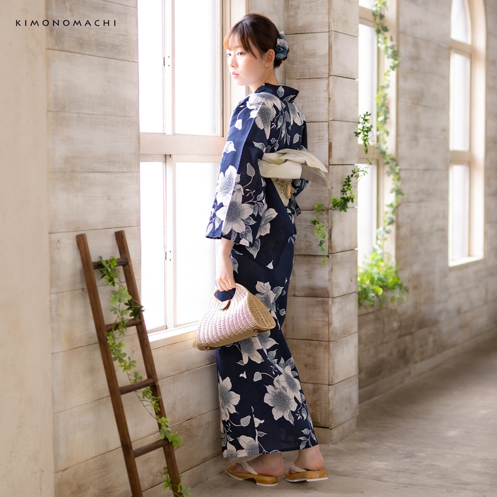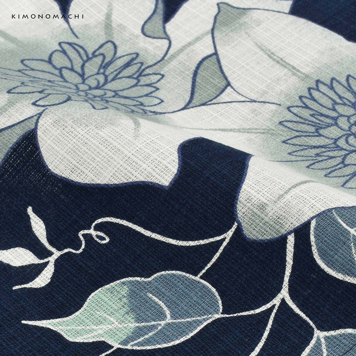 深いネイビーの地。紺色の輪郭線で表された白にブルーグレーのクレマチスの花。白い輪郭線に青灰色と薄緑の葉。レトロな柄行と古典的な色遣いが魅力の浴衣です。