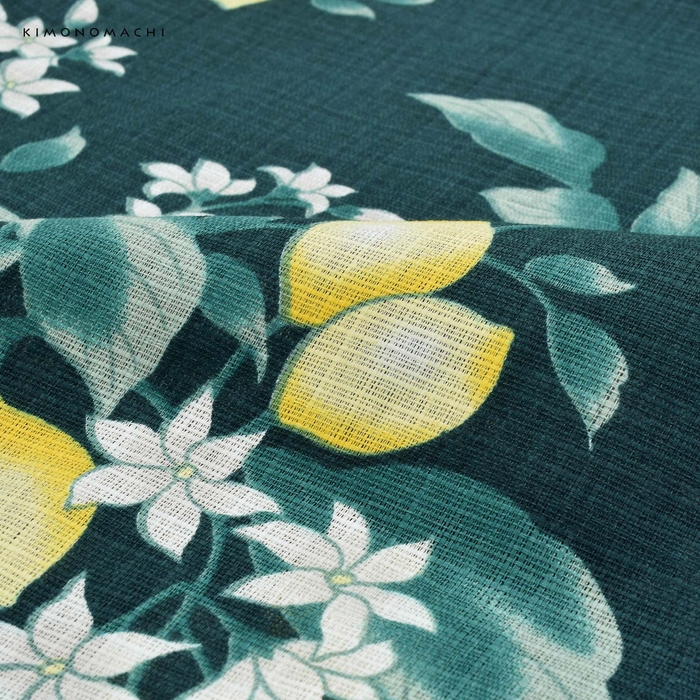 暗めの青緑色の地に、花や実をつけたレモンの柄。浅い青緑と白緑色のぼかしの葉。白と淡いグレーの花。明るい黄色、白のつややかな実。レモンの瑞々しさを感じさせるデザインが、新鮮な魅力を放ちます。