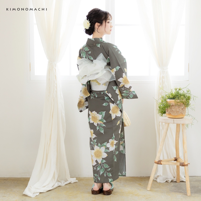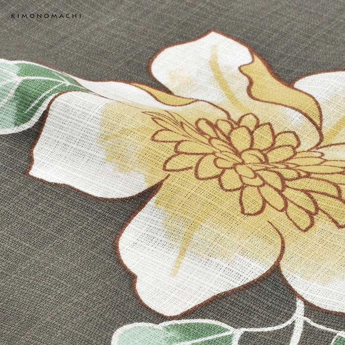 わずかに緑みのグレーの地。茶色の輪郭線で表された生成り色に淡い黄色のクレマチスの花。白い輪郭線にくすんだ緑と薄緑の葉。レトロな柄行と現代的なカラーが魅力の浴衣です。