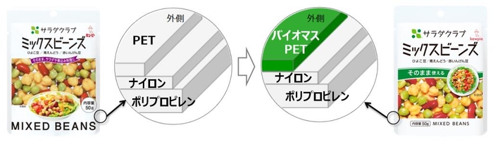 今回、環境負荷をより小さくするため、植物由来のプラスチック(バイオマスPET)を一部に使ったパウチを、全19品のうち12品で採用します。パウチの材質変更により、年間で約18トンの温室効果ガスを削減することができます。