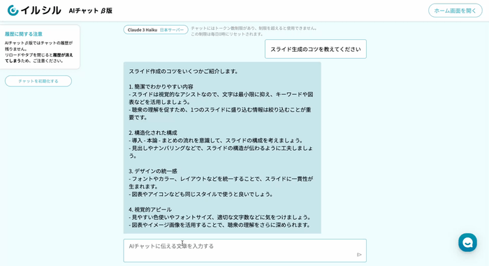 最初に、「スライド生成のコツを教えてください」と送ると、AIはスライド作成のコツを複数紹介してくれました。