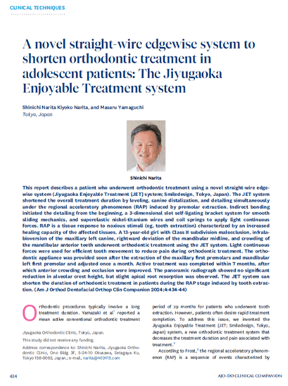 *1 Shinichi Narita Kiyoko Narita, and Masaru Yamaguchi, “A novel straight-wire edgewise system to shorten orthodontic treatment in adolescent patients: The Jiyugaoka Enjoyable Treatment system” AJO-DO Clinical Companion December 2024 Volume 4 Issue 6 p434-444 https://www.ajodo-clinicalcompanion.com/article/S2666-4305(24)00103-1/fulltext