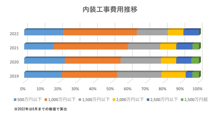 当社が2019年1月~2022年8月の間に居抜き店舗を活用し、出店支援を行った全247店舗の坪数に伴う内装工事費用平均調査(平均工事単価は1坪当たり50万円で算出)によると、内装工事費用平均2,500万円超の出店比率が2019年以降減少傾向にあることが分かります。