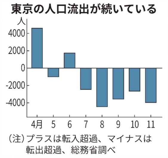 2020年11月は1都3県 東京圏全体でみると、転出者数は9.7%増の2万2446人、転入者数は9.0%減の2万2166人と転出超過だった。(日本経済新聞より)