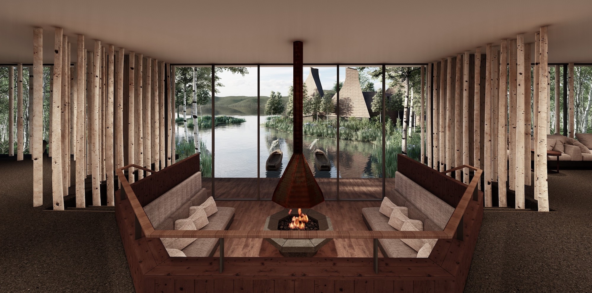 湖面にはアイヌの建築方法である、丸太組みの三脚構造を再解釈した「カシ」と呼ばれる湯小屋が集落の様に佇みます。まるで湖に浸かっているかのような露天風呂は、モール泉を心行くまで満喫でき、「ココロカムイ」(温泉の神)に感謝を捧げる神聖な空間となります。アイヌの人々の暮らしや自然観、家族観から学び、現代にあった新しい形で再現したデザインとなっています。