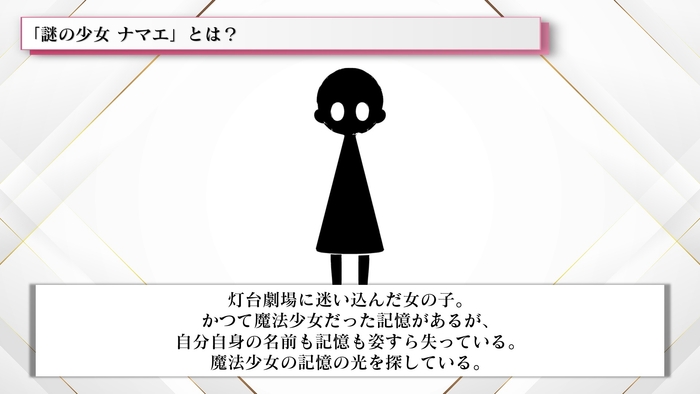 灯台劇場に迷い込んだ女の子。かつて魔法少女だった記憶があるが、自分自身の名前も記憶や姿すら失っている。