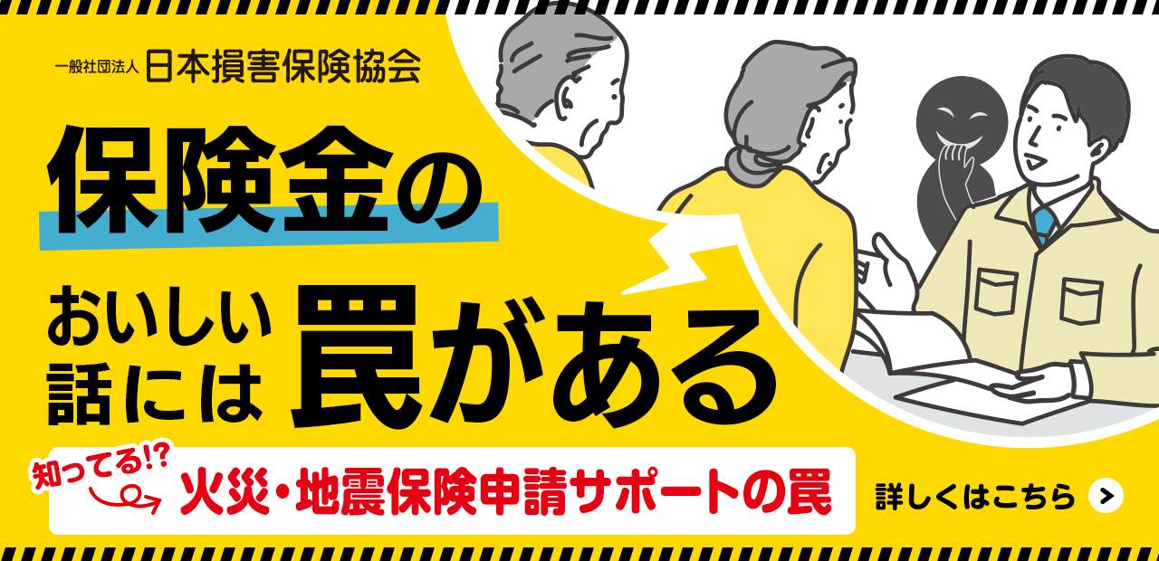 災害に乗じて、訪問やインターネット、SNS等で「保険が使える」・「保険金請求をサポートする」などと言って火災保険・地震保険の請求を勧誘する悪質な業者とのトラブルなどに関する相談を受け付けます。