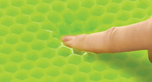 衝撃の吸収、圧力の分散に適した模様「ハニコム(蜂の巣)」をしたゼール型新素材「Vetagel(TM)(ベタゼール)」を開発しました。Vetagel(TM)は六角形の模様の高弾性のゼール素材であり、ハニコムの中心部が空いている構造で風の通り道を作った、通気性の良い素材です。