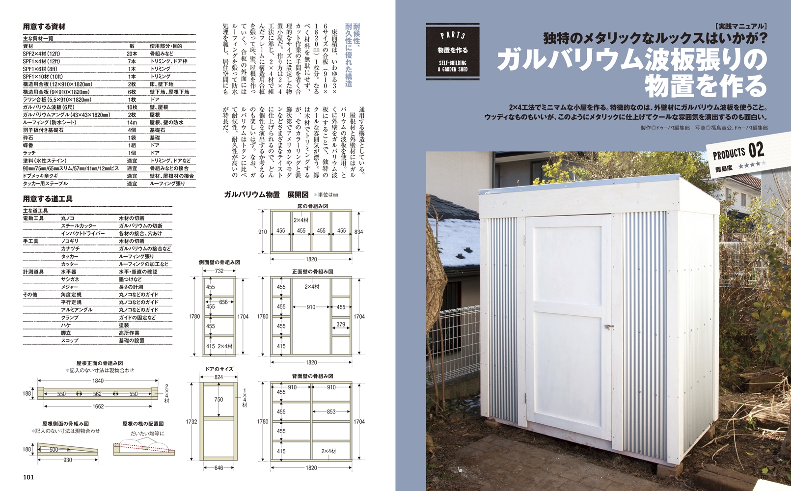 物置をつくるために必要な資材一式と各部寸法が詳細に記載された展開図、さらに作業で必要となる工具一式を紹介。このままの仕様で作るのもヨシ、自分にあったサイズやデザインにアレンジするのもアリだ。