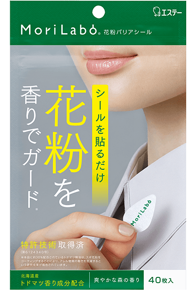 「MoriLabo 花粉バリアシール」は、衣類にシールを貼るだけでトドマツの香りが顔の周りに浮遊するスギ花粉をコーティングし、アレル物質の働きを低減します。