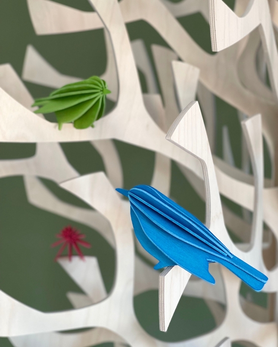 平面の板から組み上がった作品は、親しみ深く、身近に飾りたくなるものばかりです。彼女が16年の間にデザインしてきた、小さな動物作品から、大きなツリーまでを一堂に集め、紹介いたします。