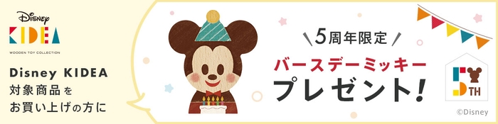 DADWAY店舗ではDisney KIDEAを税込5,500円以上、オンラインストアでは対象商品(税込5,500円以上の商品)をご購入いただいた方を対象に、5周年限定デザイン『バースデーミッキー』のKIDEA(非売品)をプレゼントいたします。