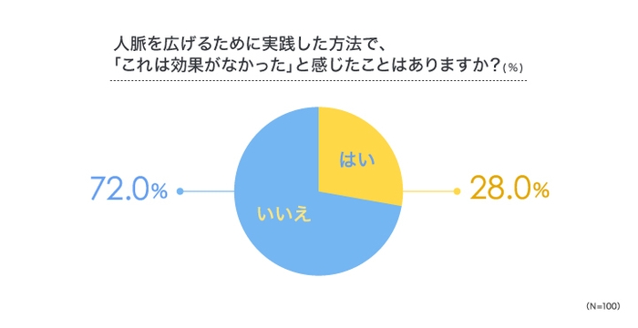 また、「人脈を広げるのに実践したことで効果がなかったことはあるか」という質問をしたところ、7割以上の方が効果があったという内容を回答が得られました。