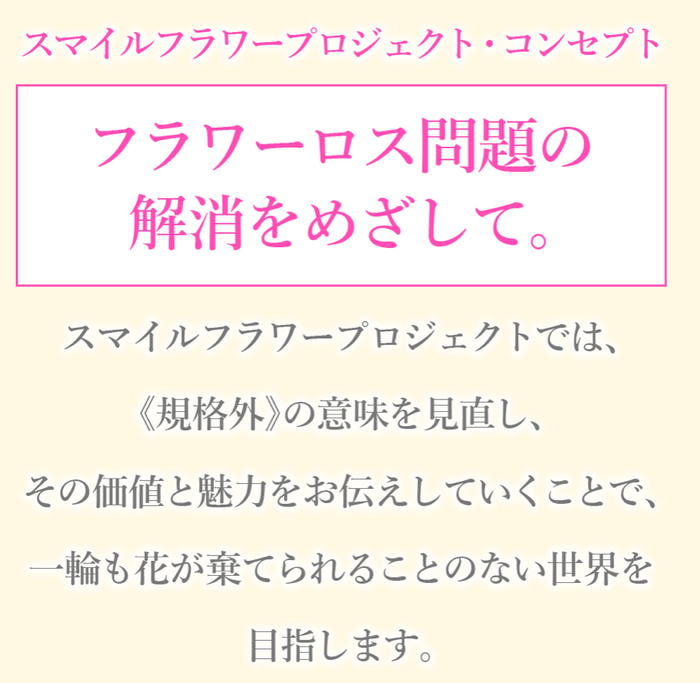 2020スマイルフラワープロジェクトは、 「フラワーロスからお花を救う」ためのプロジェクトです。 市場やお店に並ぶ前に、大量に破棄されている花や、花農家さんの経営を支援する目的で発足しました。 2020年4月11日のサイト立ち上げ以降、これまでに累計1万2000件以上(2021年3月末現在)のご注文をいただき、行き場を失い破棄の運命にあったお花を皆さまのもとにお届けすることができました。当サイトでご購入いただけたお花のほか、フラワーロス救済イベントなどでお配りしたり、飾られたお花も含めますと、救済できたお花の本数は、100万本以上です。(2021年3月末現在)