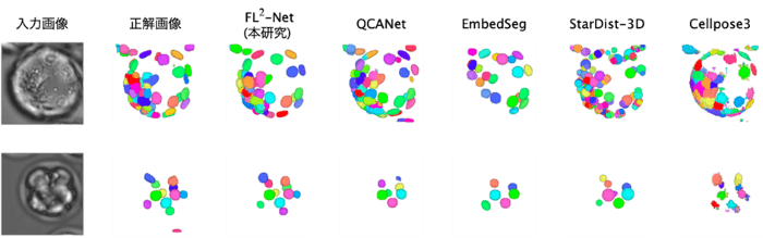 本研究ではまず、マウス胚が成長していく過程を撮像した時系列3次元明視野顕微鏡画像データを用いて、細胞核の特徴を定量するためのセグメンテーションアルゴリズムFL2-Netを構築しました。FL2-Netは、細胞が密集している領域でも正確に細胞核を識別するための機構を備えているほか、時系列画像における連続フレームを参照することで時間的な変化も考慮した予測を行うという特徴があります。その結果、FL2-Netは、既存のAI手法(QCANet, StarDist, EmbedSeg, Cellpose3)をすべて上回る精度を実現しました。(図2)
