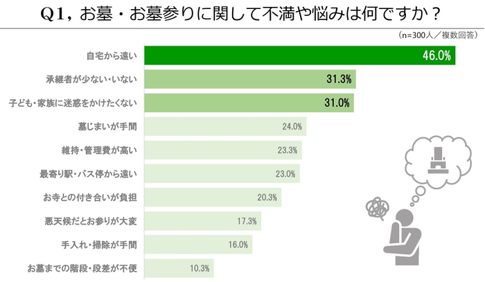 今回のアンケートに先駆け、アンカレッジが2021年に実施した「お墓、お墓参りについてのアンケート」では、お墓参りに関する不満の第1位に 「自宅から遠い」(46.0%)が挙げられました。次点の 「承継者が少ない・いない」(31.3%)、「子ども・家族に迷惑をかけたくない」(31.0%)に実に10ポイント以上も差をつけています。