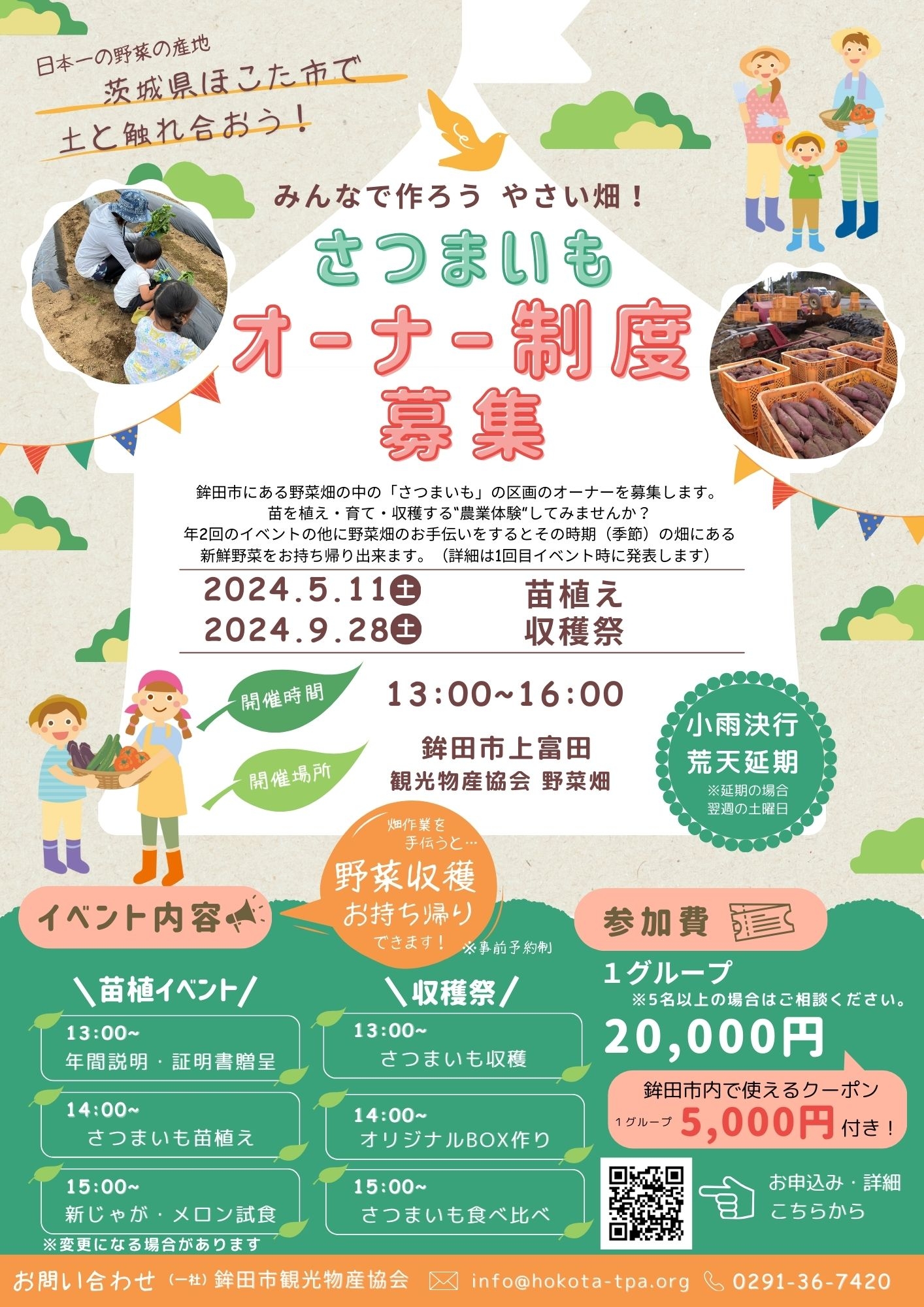 鉾田市観光物産協会(所在地:茨城県鉾田市大竹390)は、さつまいものオーナー体験ができる「畑オーナー」を2024年4月1日より募集開始しました。