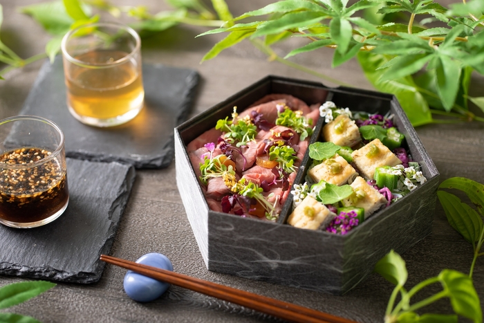 “鰻としらすの山葵香るひつまぶし”と“ローストビーフ丼”の2種類が楽しめる特製弁当。和テイストの鰻は白出汁で炊き上げさっぱりとした味の白焼きに仕上げ、塩味の効いたしらすと刻み山葵の食感と香りがアクセントになっています。夏らしく酸味を利かせた出汁ジュレでお楽しみください。また、洋テイストは、ホテル内レストラン【匠】で使用している“国産牛”の部位を厳選し、【シェフズ ライブ キッチン】の名物料理“ローストビーフ”を使用。レストラン料理長の絶妙な火入れにより、柔らかく旨味が凝縮され、冷めても美味しいローストビーフに仕上げました。付けダレは“ポリネシアンソース”でお楽しみいただけます。