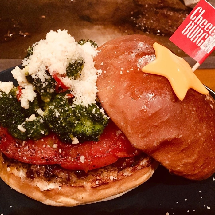 焼きトマト、ブロッコリーのアヒージョ、粉雪のようなパルメザンチーズそして、頂上のお星さまと見た目にも楽しい期間限定のクリスマスバーガーです。