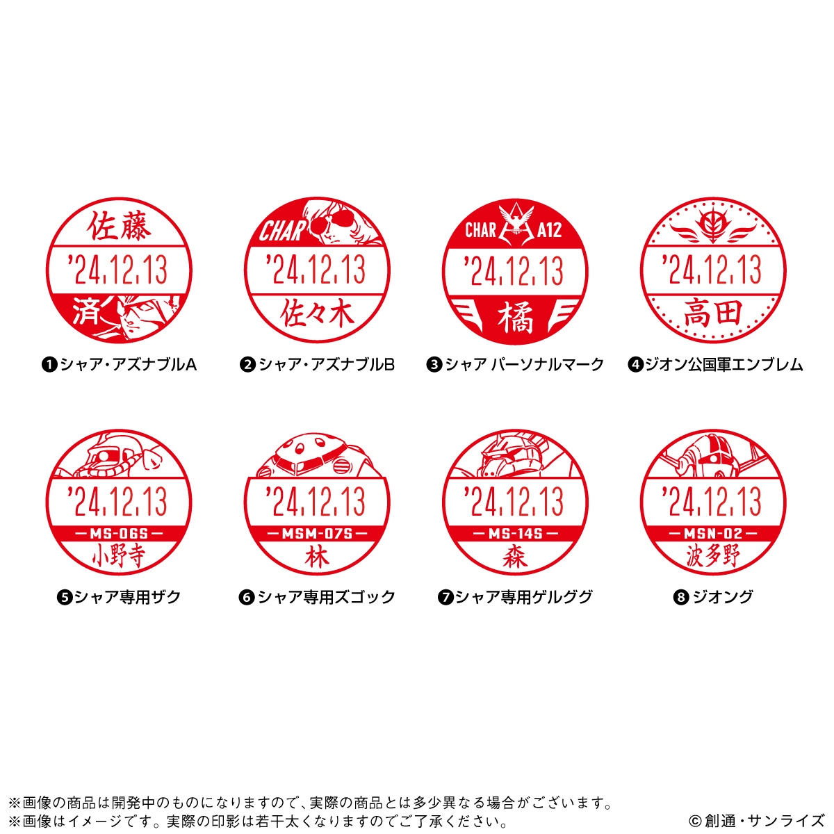 シャアの顔やシャア専用モビルスーツ、所属部隊のエンブレムなど8種類のデザインから選べます。また、お好きな文字(3文字以内)を同封のハガキでオーダーして印面を作成可能。印章・文具メーカー「シヤチハタ株式会社」とのコラボレーション商品です。