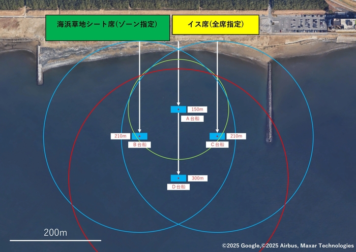 ・ダイヤモンドフォーメーションの台船配置で実現する迫力の花火体験
