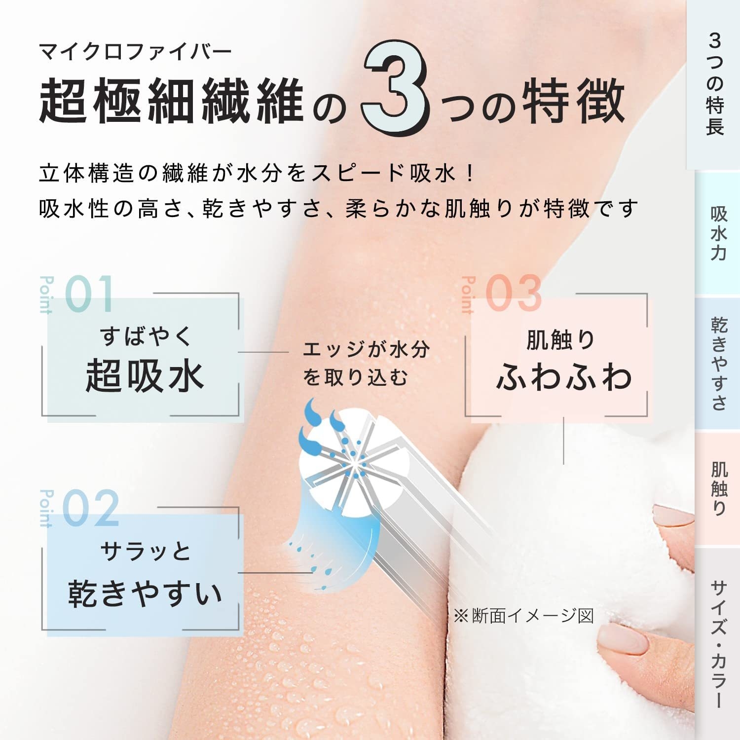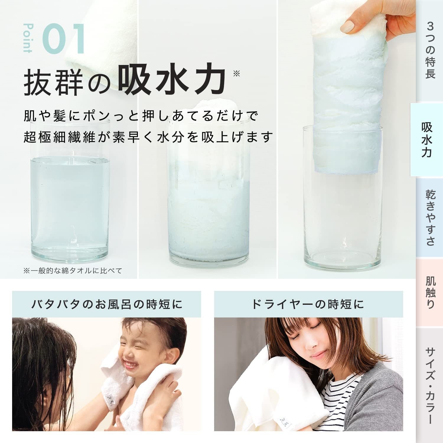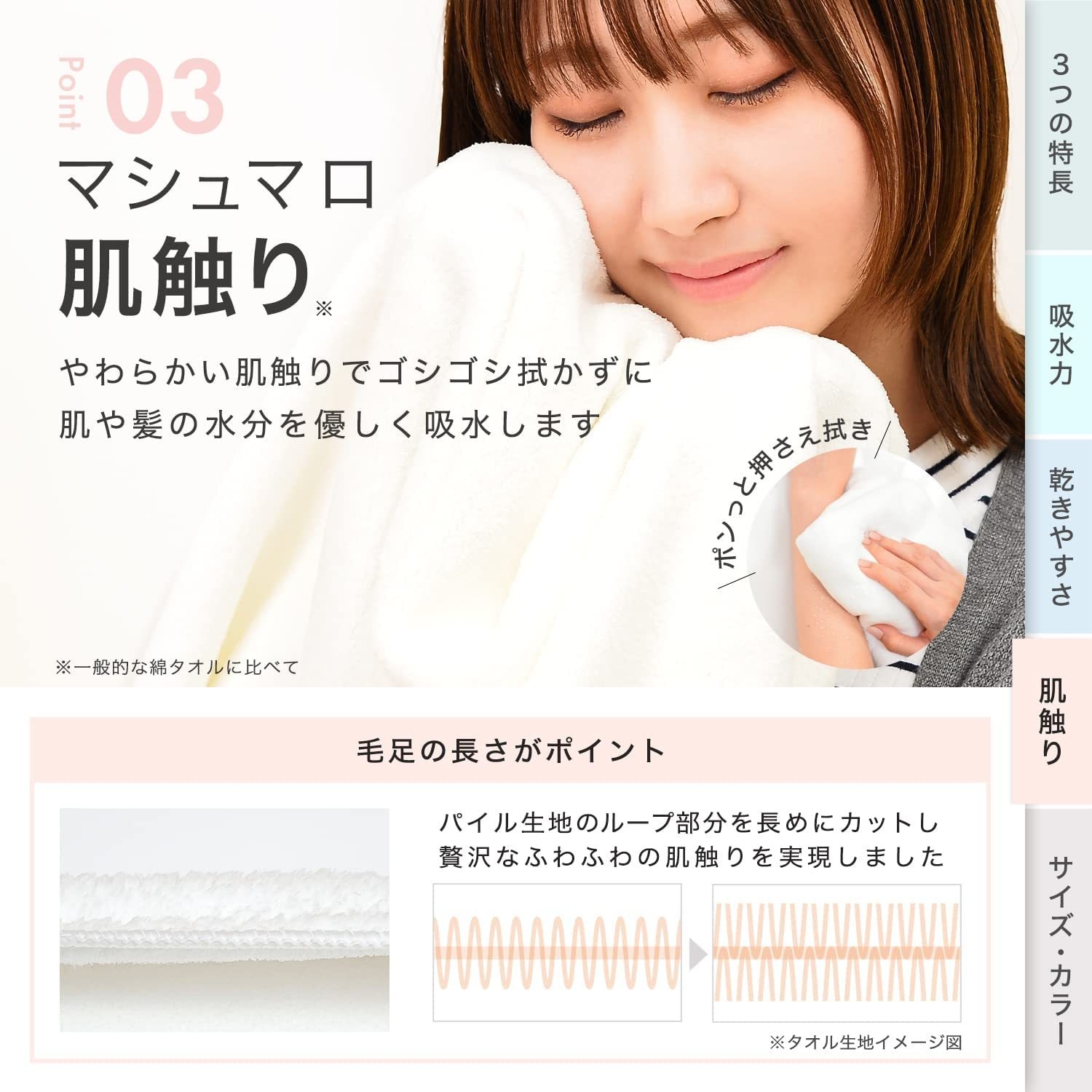 毛足が長い超極細の繊維により、やわらかくてなめらかな肌感触です。吸水性が高いので、ゴシゴシこすらずに優しく肌をおさえるようにお使いいただくと、お肌に負担をかけずに水分を取り除けます。