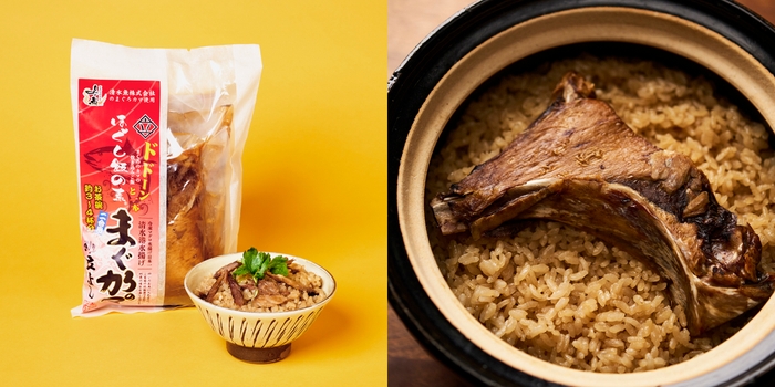 冷凍まぐろの水揚げ量が日本一の清水港で水揚げされた特大サイズのまぐろのカマを豪快にまるごと一本使用したインパクト抜群のほぐし飯。「割烹立よし」の板前が旨みを逃さぬよう丁寧に火入れしたまぐろのカマは、ふっくらとした肉厚な身からじんわりと脂の甘みが溢れ出し、噛むほどに深いコクと旨みが広がります。釜いっぱいの大ぶりな身に見ても食べても満足いただけること間違いなし!