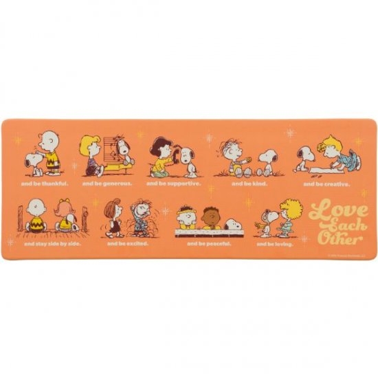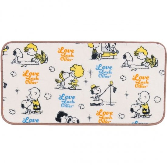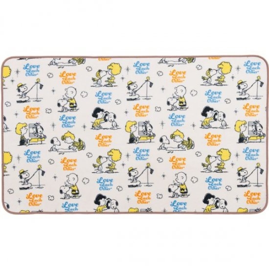 スヌーピーとフレンドたちがコミュニケーションをとっているイラストがキュートな、ラグマットです。