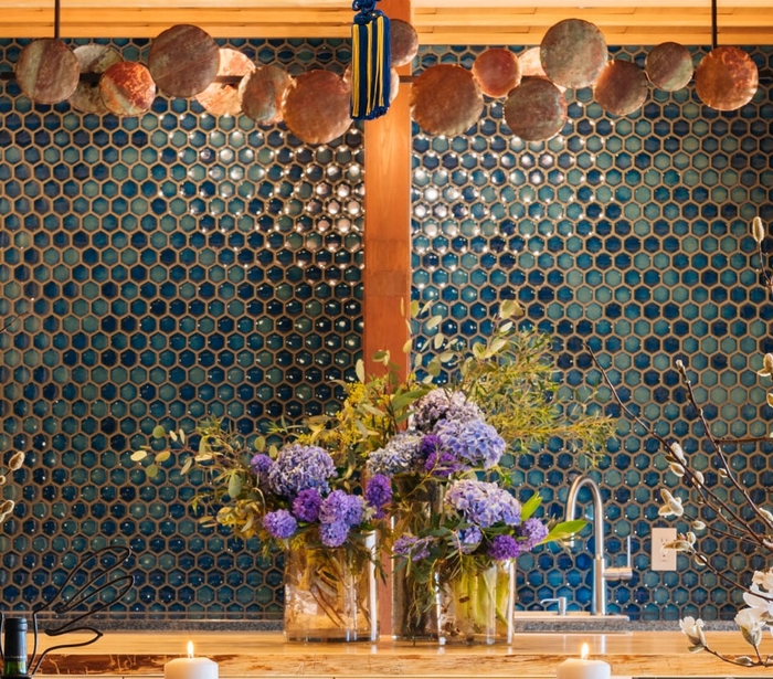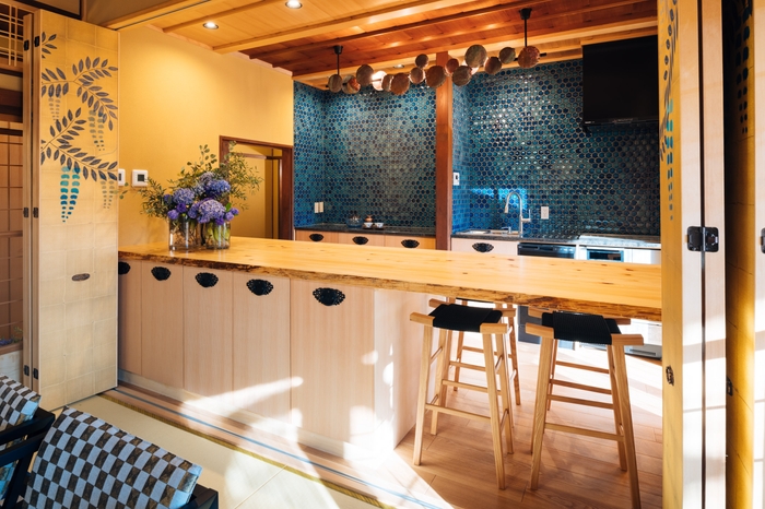 洗練されたデザインのダイニングテーブルの素材にはサステナブルなヒノキの間伐材を使用。壁やタイルが彩る黄金色と青が、鮮やかなコントラストを生み出します。
