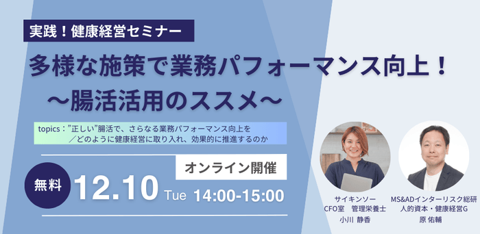 視聴無料「<実践!健康経営セミナー>多様な施策で 業務パフォーマンス向上!~腸活活用のススメ~」12/10(火)開催 | NEWSCAST