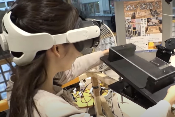 ヘッドマウントディスプレイには、手に持った迷路板でビー玉を転がす俯瞰視点と、ビー玉となって迷路の中に入り込んだ視点が同時に投影されます。さらに足元は、迷路の傾きを自作の床面傾斜装置で表現し、自分の平衡感覚までも錯覚させられる素晴らしい作品に仕上がりました。
