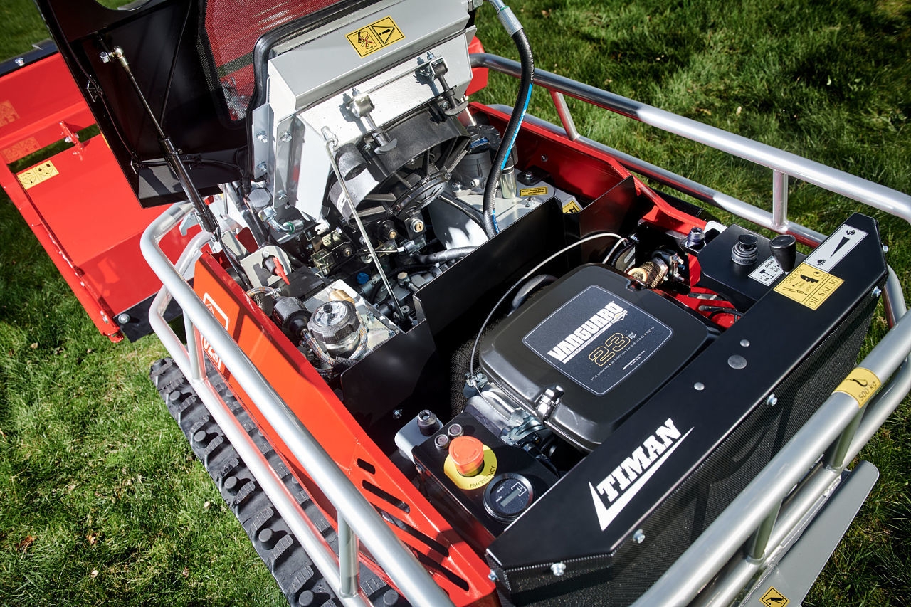 左右独立して傾くクローラーでしっかり地面をグリップ。スプロケットやリンク、ベアリング類は金属製で耐久性に優れ、パワフルな油圧駆動で荒れた地面や急な斜面を自由自在に走行できます。