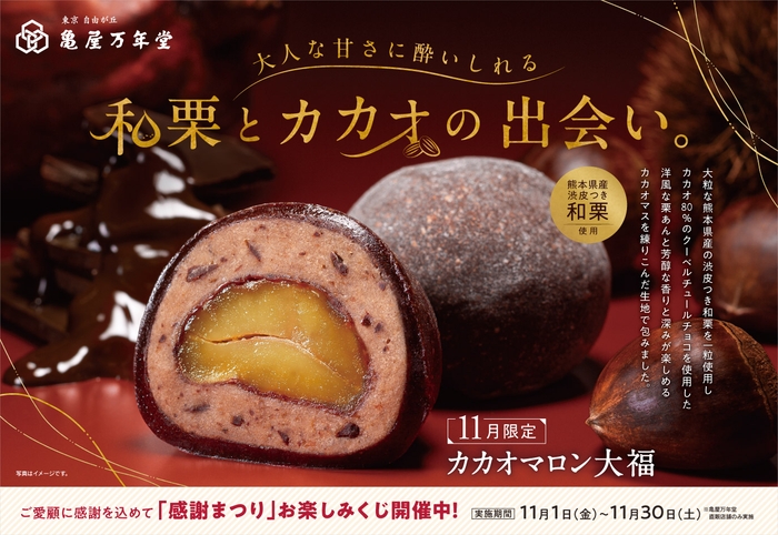 存在感のある大粒の熊本県産和栗を一粒使用するだけでなく、合わせる素材の組み合わせによって幅広い美味しさをお届けする11月限定販売の和栗大福2種は、東京・自由が丘にある総本店をはじめ直販24店舗(東京・神奈川)にて好評販売中です。ぜひお近くの亀屋万年堂までお越しください。