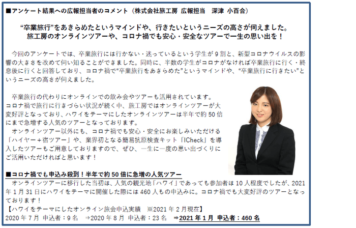 コロナ禍での卒業旅行に関する意識や実態を反映したアンケート調査となっております。報道の一資料として、ぜひご活用ください。