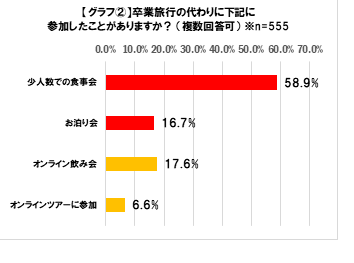「卒業旅行の代わりに参加したこと」を質問したところ、「少人数での食事会」が58.9.%。「オンライン飲み会」が17.6%、「お泊り会」が16.7%。
