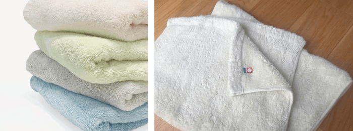 「SUPER ZEROⓇ」という特殊な撚糸工法の糸により、繊維の間にすき間ができたっぷりと空気を含むため、吸収力が高くふんわり感も持続します。毛羽落ちが少なく、耐久性が高いことも特徴。