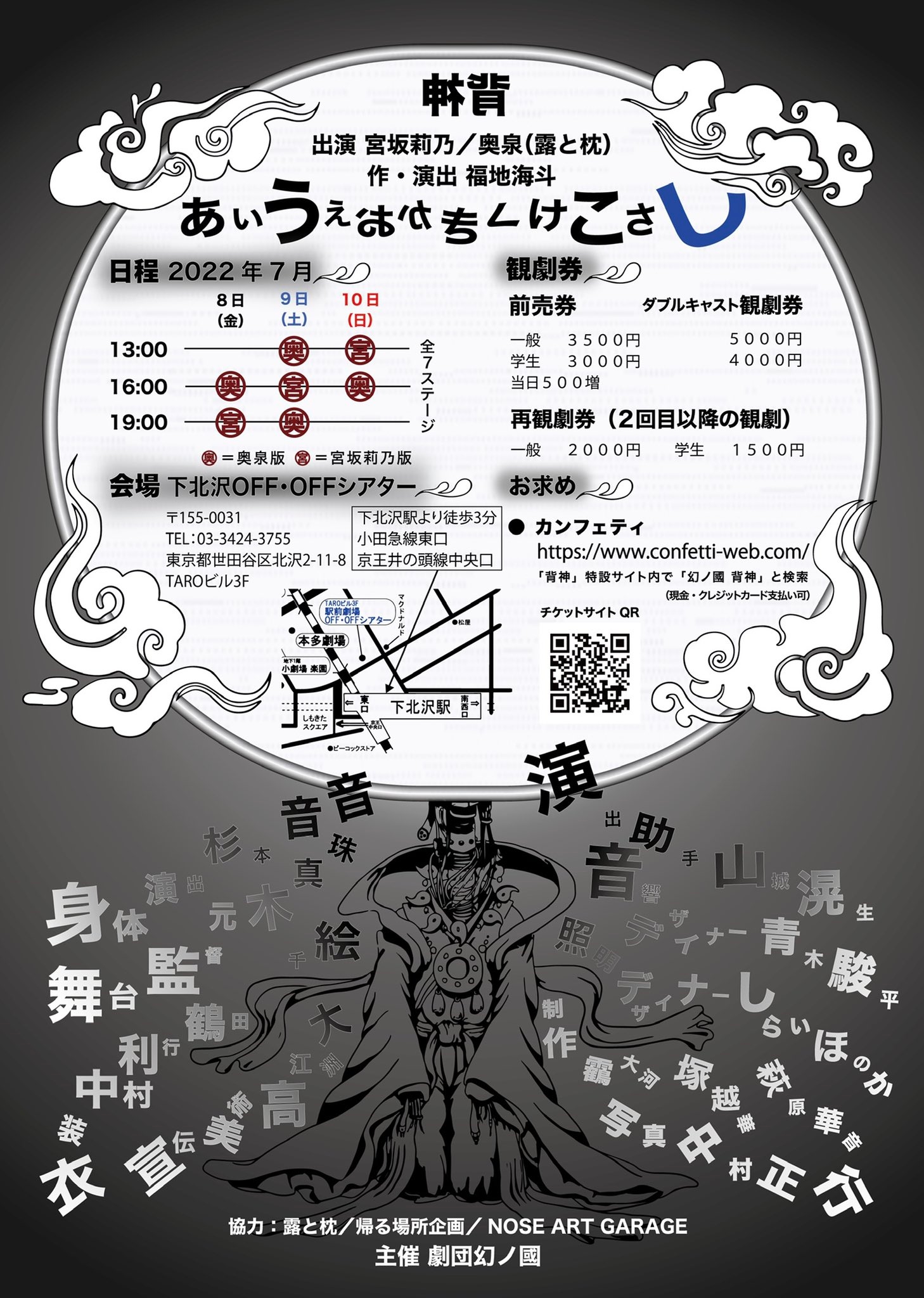 幻ノ國(主宰:福地海斗)主催、幻ノ國 第10回番外公演 『背神』が2022年7月8日 (金) ~2022年7月10日 (日)に下北沢 OFF・OFFシアター(東京都世田谷区)にて上演されます。チケットはカンフェティ(運営:ロングランプランニング株式会社、東京都新宿区、代表取締役:榑松 大剛)にて発売中です。