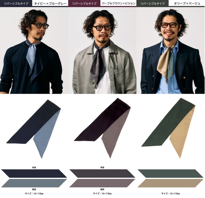 異なるカラーの無地のシルク生地を貼り合わせたコレクション。どちらの面を上にした場合でも、首に無造作に巻きつけたときに裏の色がチラチラとのぞき、首回りを洒脱に仕上げます。じつは色だけでなく、一方はジャカードでシャンタン風の織り模様をつけてマットに仕上げたシルク生地、もう一方の面は光沢のあるシルクサテンを裏使いしたツイール生地と、生地の風合いが異なるのも特徴。これによりマットとサテンのコントラストが楽しめます。色の組み合わせは、「ネイビー×ブルーグレー」「パープルブラウン×ピジョン」「オリーブ×ベージュ」の3タイプ。いずれも同系色の組み合わせに加え、明度や彩度を抑えたニュアンスカラーと呼ばれる色調をセレクトしたことで、派手になりすぎる心配はありません。