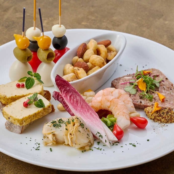 〈セイボリー〉オリーブのピンチョス、うずら卵のピンチョス、海老のサラダ、ホタテのマリネ、パテ・ド・カンパーニュ、クリームチーズ、ミックスナッツ