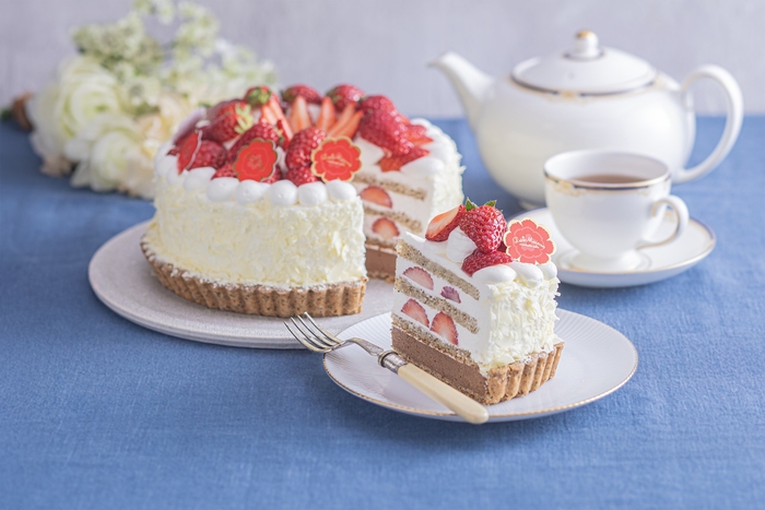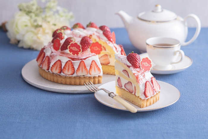 紅茶ショコラカスタードタルトにふわふわなアールグレイスポンジとホイップクリームを重ねました。甘酸っぱいいちごをしのばせ、いちごと紅茶の香りをお楽しみいただけるタルトです。