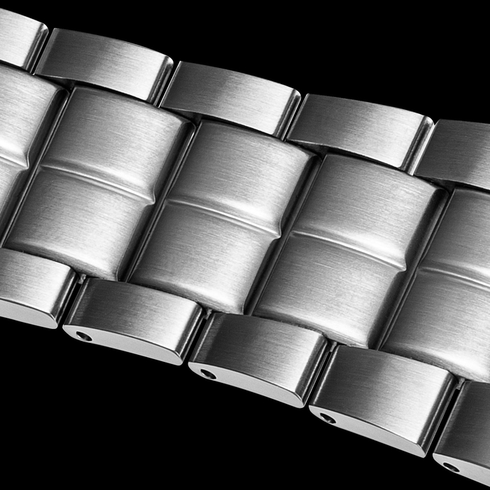 ■心地よい装着感を体感できるスポーティーな新設計ブレスレット。ケースやベゼルの仕上げ方法と同様、マットな質感のヘアライン&アクセントとなる鏡面仕上げを採用することで落ち着いた高級感を演出。