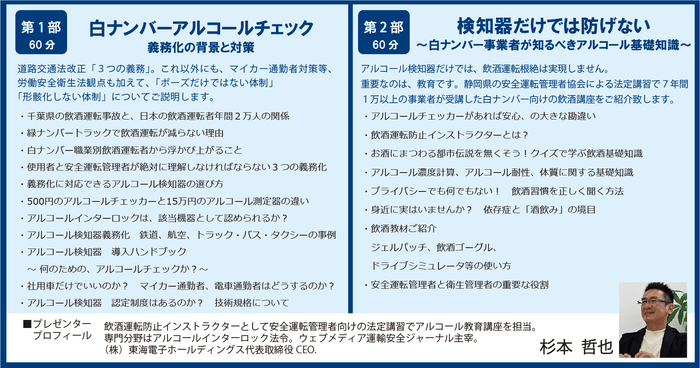 IT点呼システム及びアルコール検知器を開発・販売する東海電子株式会社(本社:静岡県富士市 代表取締役:杉本 哲也)は、 この度、来年4月からの安全運転管理者選任事業所の飲酒検査義務付けの改正にともない、白ナンバ-(社用車)アルコールチェック義務化対象事業者の皆様へ向けての対策セミナー『白ナンバーアルコールチェック義務化対策セミナー』を10月13日(水)、15日(金)に無料オンライン開催をいたします。