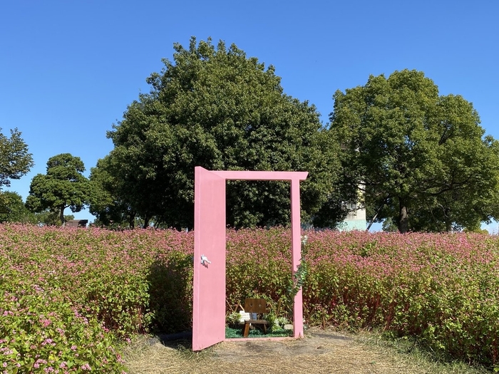 白い花をつける「白そば」も元気に咲き誇っているため、舎人公園では現在、紅白の花壇が創出されています。花壇を彩るフォトスポットもSNS等で大好評です。東京では珍しい「そば花壇」。来年春に展開する花壇の準備のため、この「そば花壇」が楽しめるのもあと僅かとなっています。