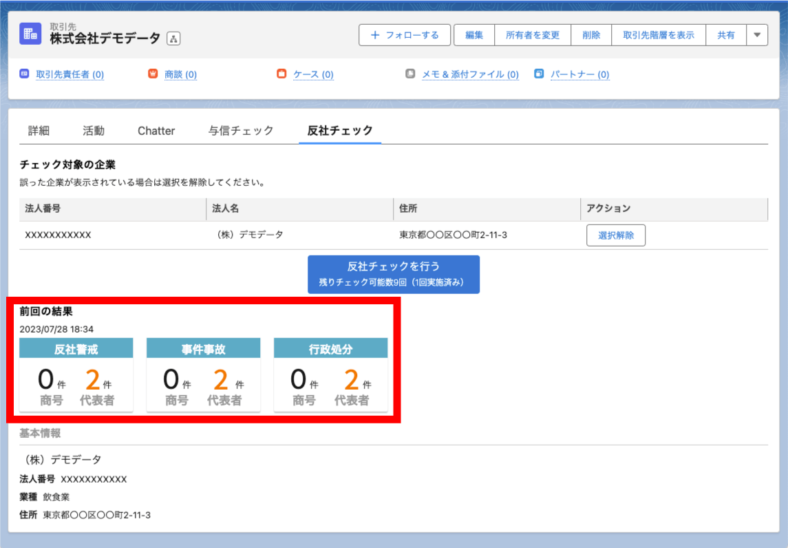 「反社チェックを行う」ボタンのクリックで、「反社警戒」、「事件事故」、「行政処分」件数を把握することができます。
