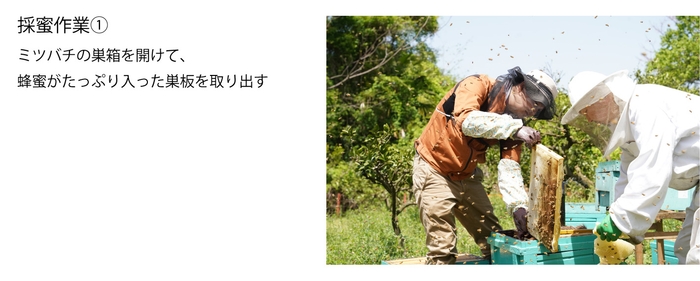 4月13日朝 養蜂家さんが蜂蜜を採る現場へ車で直接訪問。いざハニーハンターも加わり採蜜作業開始。採蜜した蜂蜜は、その場で値段交渉し、車に積んで瓶詰めを行う山科工場まで持ち帰る。