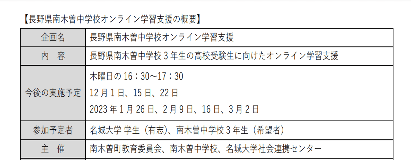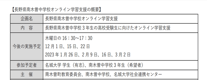 この取り組みは、2020 年1 月に本学と南木曽町との包括連携協定締結がきっかけで、2020 年 2 月からスタートし、今回で 3 期目。今年は11月10日から本格的な学習支援が始まり、毎週木曜日午後4時30分から1時間、本学の学生は主に自宅から、南木曽中学校の生徒は放課後の学校から各自Zoomでつながり、支援を継続しています。