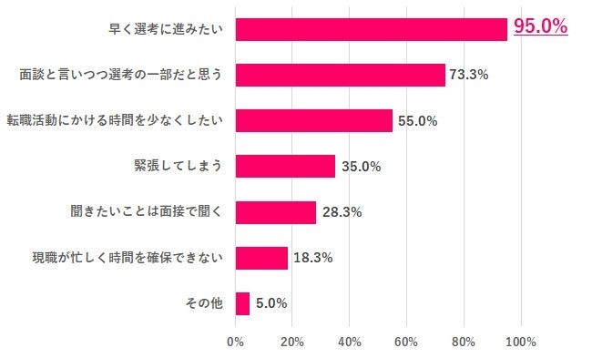 カジュアル面談をしたくないと回答した人に、その理由を聞いたところ、「早く選考に進みたい」95.0%が最も多い回答となりました。続いて、「面談と言いつつ選考の一部だと思う」73.3%、「転職活動にかける時間を少なくしたい」55.0%が上位でした。