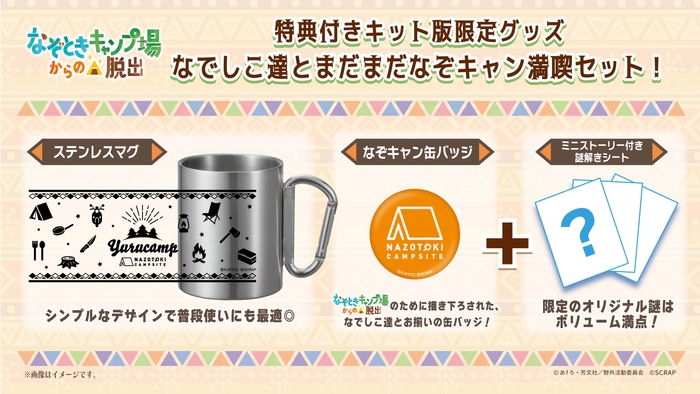 また、商品は通常キット版と特典付きキット版があり、特典付きキット版をお買い求めの方には、本ゲームでキャラクターが着用した「缶バッジ」、おうちで使える「ステンレスマグ」、「ボリューム満点! ミニストーリー付き謎解きシート」の3つの特典が付いてきます。『ゆるキャン△』ファン必見の内容になっておりますので、ぜひ、先行予約期間中にお得にお買い求めください!