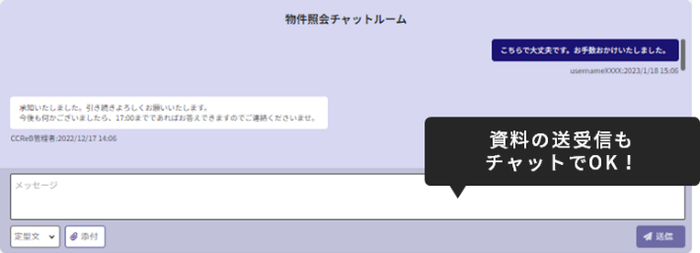 社外情報への照会時、システム上で当社とチャット連絡が可能。資料の送受信も含めチャット上でやりとりが完結します。
